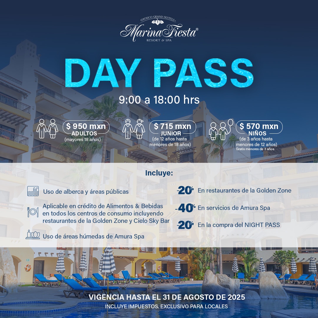 Aplicable en crédito de Alimentos & Bebidas en todos los centros de consumo incluyendo restaurantes de la Golden Zone y Cielo Sky Bar